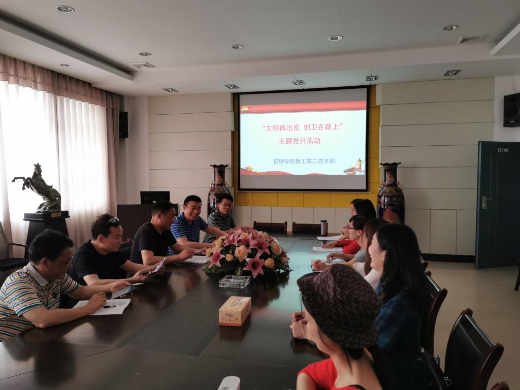 2019年5月28日下午,管理学院教工党员二支部进行了创卫宣讲党日活动。教工二支部书记余博带领党员同志学习了《湘潭市创建国家卫生城市工作方案》、《打好创卫攻坚战,党员争当急先锋倡议书》、《文明再出发,创卫在路上》。学习之后,党员同志们积极发言,争取为湘潭市创建国家卫生城市作贡献。