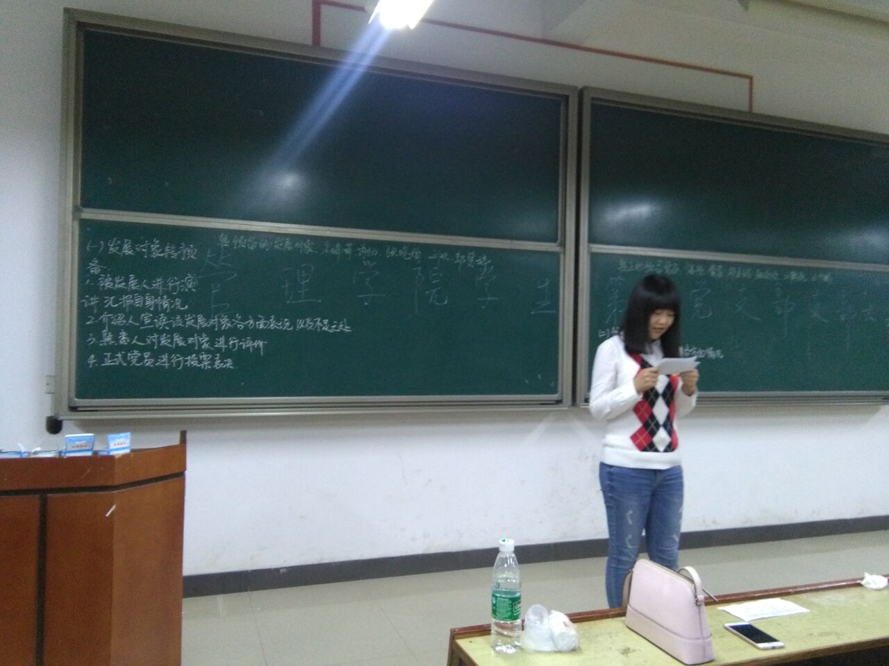 2016年5月29日晚上7点-9点,管理学院学生第六党支部支部大会在新校区d301举行,参加本次会议的有管理学院学生党支部书记周艺老师、支委张欢欢,以及管理学院学生第六党支部的正式党员、预备党员、本学期发展对象和部分入党积极分子。本次会议的主持人是管理学院学生第六党支部候补支委王鹤凯,记录人是管理学院学生第六党支部学生党员马慧娟。