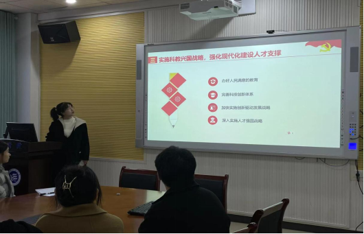 随后,第二个讲解的是来自旅游管理1901班的正式党员陈梦佳讲到:“实施科教兴国战略,强化现代化建设人才支撑要办好人民满意的教育,完善科技创新体系,加快实施创新驱动发展战略,深入实施人才强国战略。”