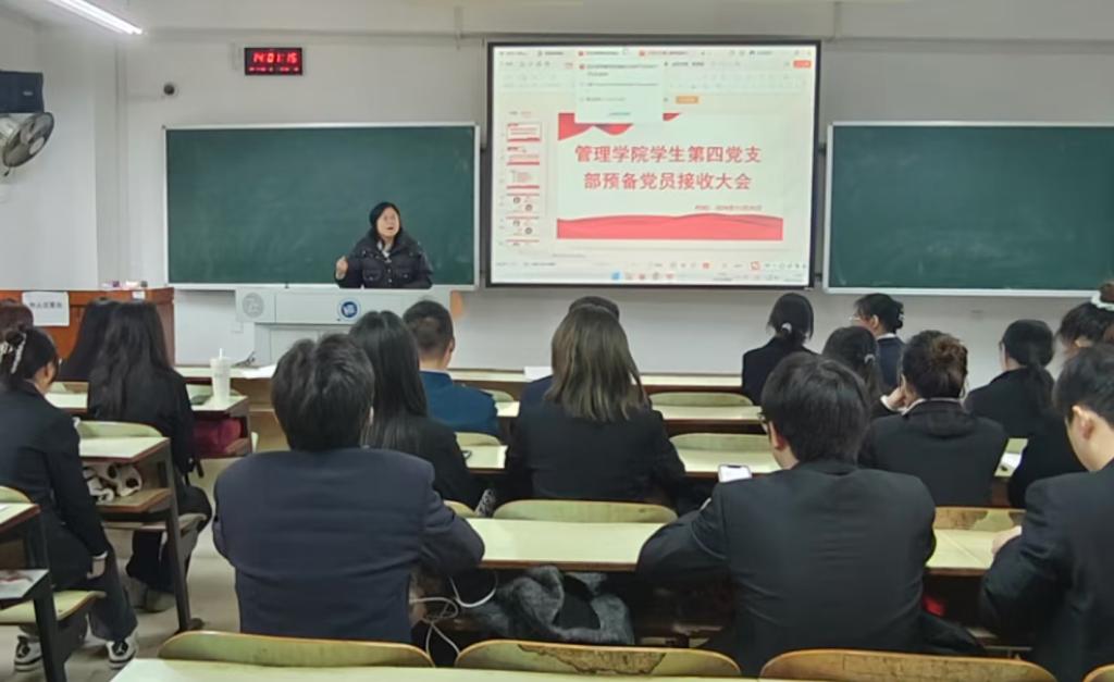为深入学习贯彻习近平新时代中国特色社会主义思想和党的二十届三中全会精神,加强党组织建设,提高党员质量。11月25日,管理学院学生第四党支部在新校区B-301召开预备党员接收支部大会。本次会议由支部书记周艺主持,管理学院学生第四党支部全体学生党员参加。