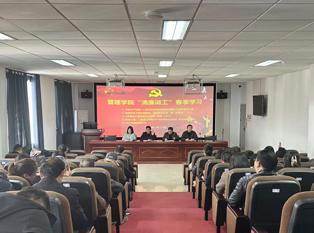 3月12日下午,管理学院在F510召开教职工大会,开展“清廉湖工”春季学习和师德师风专题教育学习,由学院党委书记余博主持,全体教职工参加学习。