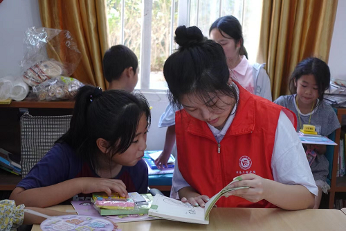 在村委会图书中心,学生党员们和留守儿童围坐在一起,为他们进行名著导读。此外,学生党员们还组织孩子们进行手工绘画,手把手对他们进行指导,画出了一幅幅色彩鲜艳,线条灵动的画卷。