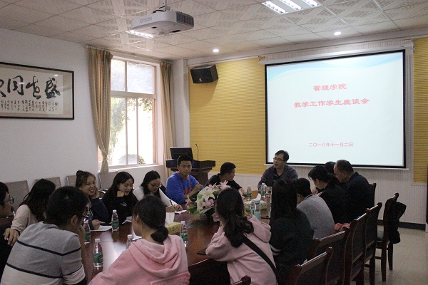 管理学院院长张建新指出此次会议的主要目的是听取老师授课情况和学生上课情况的意见和建议,以便进一步改善教风和学风;副院长余博希望各位同学就学院的教学管理和安排方面提出意见和建议;党总支副书记钱祖煜指出目前学院的到课率虽然有所上升,但是抬头率不高,他希望同学们反思自己的学习态度,班委要以身作则,起到良好的带头作用。