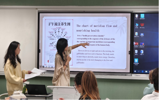 "拍八虚"养生体验开篇,留学生在实操中感受经络疏通的效果;中医哲学分享环节以"人体生物钟"为喻,解读"子午流注"理论与"天人合一"思想;"望闻问切"四诊法通过互动演示让留学生直观感受辨证施治逻辑;"五色食物养五脏"环节由学生助教讲解药食同源知识,留学生在品尝养生茶中体会"寓医于食"智慧。此外,穴位针灸、拔罐展示,面部刮痧、艾灸体验及八段锦教学人气高涨,活动最后以制作中医药主题手串收尾。