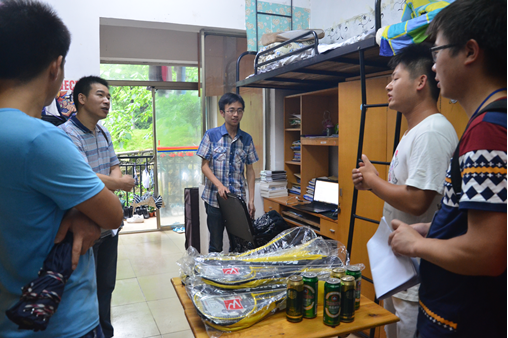 老师们分两队进行走访排查,钱书记在男生宿舍逐间走访,“接地气”的敲门,与学生们亲切交谈。在本次安全排查中学院大部分宿舍卫生状况良好,物品摆放有序,地板干净、床铺整洁,空气清新。多间连续5-6次获得校级“优秀寝室” 的同学们获得了钱书记由衷地“点赞”,并鼓励他们继续保持;对于部分卫生状况略有欠缺的寝室,给予耐心劝导,同学们表示将严格整理寝室内务。