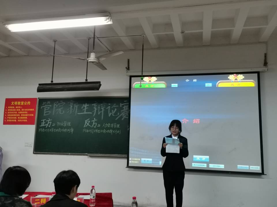 为进一步培养大学生的思维能力,营造良好的学习氛围,引导学生参与课外活动,推动书香校园建设,湖南工程学院管理学院于11月14日晚7点在南四教举办了面向21级新生的辩论赛,双方辩手就“网络对大学生的利弊影响”这一辩题展开激烈争论。管理学院21级新生到场观看。