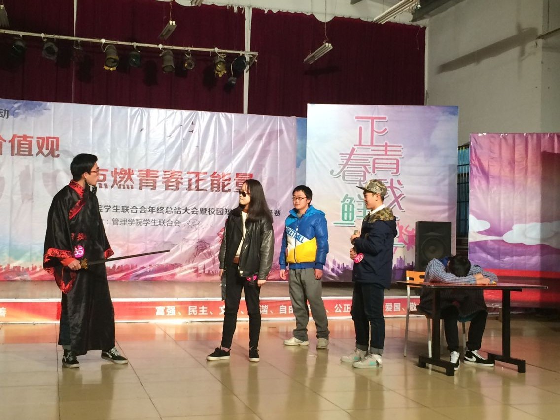 大赛伊始,党总支部书记钱祖煜进行了新年致辞,恭祝大家新年快乐。在这次大赛中,《校园无间道》、《皇帝与刺客》、《只因为爱》、《逃课那点事》、《项羽新传》五部精彩短剧。大赛中还穿插着由管理学院文艺小分队精心准备的各类舞蹈和歌唱节目,丰富大赛内容以及更好的调动现场气氛;还有轮滑协会的花式轮滑舞,Cosplay社团的Cosplay show以及汉服社的汉服展示更是将现场气氛推到了高潮。