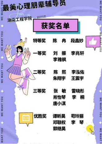 大学是人生的一个新征途,而新生在刚迈入大学时总是会充满疑惑。为了领导新生更快的适应大学生活,湖南工程学院管理学院选聘了19名心理朋辈辅导员,各朋辈在军训期间积极与新生进行沟通与联系,为新生解疑答惑。为了鼓励各位朋辈,我院于2022年10月举行了“最美心理朋辈辅导员”评选活动。本次活动由管理学院学生联合组织心理部和易班管理中心承办,面向管理学院全体学生。
