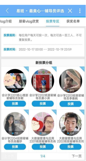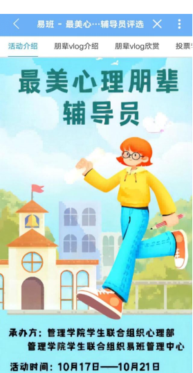 活动首先由各朋辈记录下军训生活的点点滴滴,并将其制作成Vlog视频,对新生的军训生活进行总结。然后,心理部收集各朋辈的视频,由易班管理中心进行仔细的视频审核工作,并搭建好作品展示平台并将其呈现在易班app上。管理学院全体学生于10月17日开始对自己心仪的朋辈辅导员进行投票。此次活动我院同学积极参与,最后根据得票情况选出特等奖两名,一等奖三名,二等奖四名,三等奖五名,优胜奖五名,获奖名单附下。