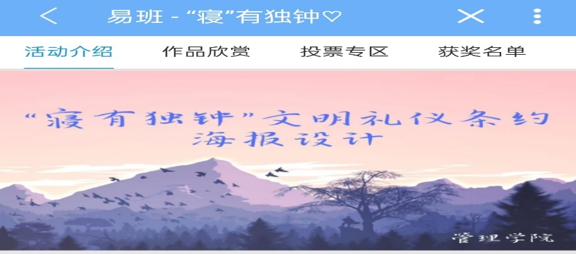 为了加强大学生寝室文明礼仪,改善寝室卫生环境,给同学们营造整洁、文明、富有文化气息的学习和生活环境,从而培养学生高尚的道德情操、良好的生活习惯和团结向上的集体精神,管理学院学生联合组织于2022年11月开展以“喜迎二十大,培根铸魂育新人”为主题的“寝”有独钟文明礼仪条约海报设计活动。本次活动由心理部承办,易班管理中心协办,面向管理学院全体同学。