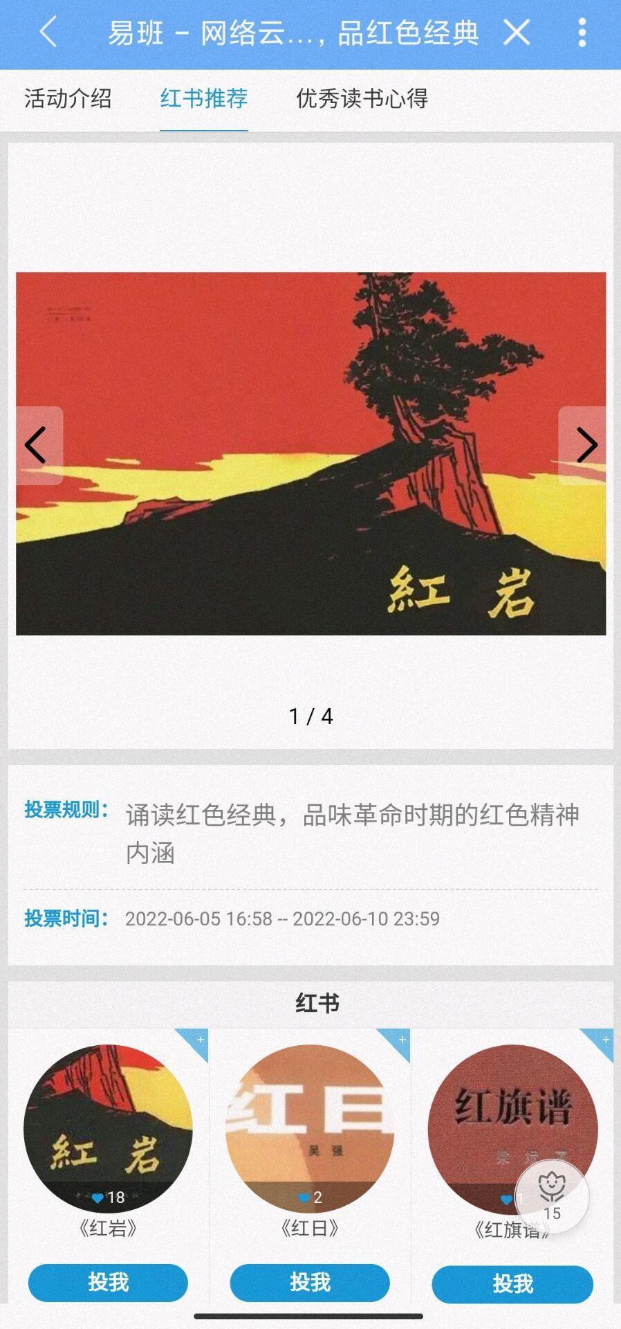 在本次活动中,各班班长与团支书做好前期准备工作,完成了各自班级的任务部署,同学们通过易班平台,以线上投票的形式推荐各自心目中的红色经典书籍,营造对红色文化的浓厚学习氛围。在班级读书会中,各班班长带领同学们阅读红色书籍的经典篇章,深刻领会其中的思想哲理,汲取爱国主义精神养料。随后,各班积极组织学生观看《朗读者--红岩篇》,以此来品味革命时期的红色精神内涵。最后,各班级利用易班平台交流阅读心得,分享阅读收获,并书写读后感,进一步增强学生的社会历史使命感和责任感。学习部择优推荐读后感至易班平台展示分享,激励同学们在红色书籍中寻找先辈的足迹,接受思想的洗礼。