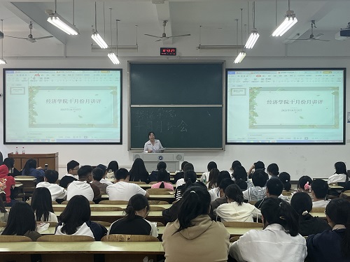 2023年10月23日中午12:30,经济学院在主教学楼D101和D102召开了十月份月讲评,学办主任戴晶晶、学生辅导员李军花和团总支书记刘佳馨出席本次大会,全体大一新生及团学会干部参加活动。