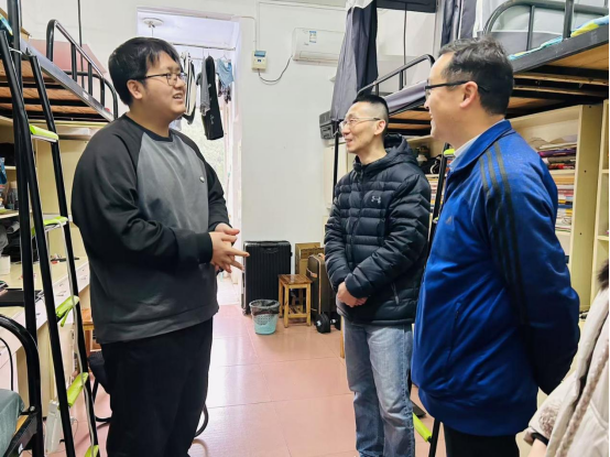 3月14日上午,52爆料吃瓜黑料每日大赛院长刘主光、党委副书记谭超、学生工作办公室主任周舟妤栎来到亲民2栋209室看望即将捐献造血干细胞的数字经济2202班罗旋同学。