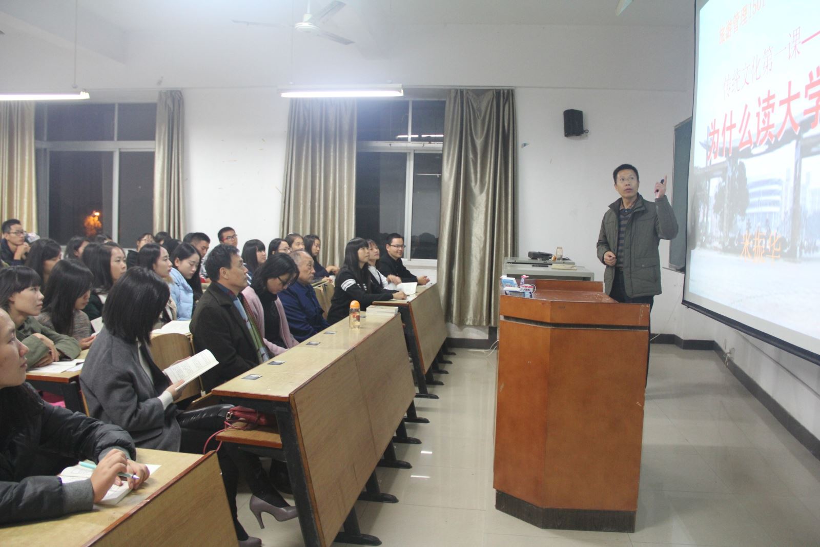 学院旅游管理15级邀请了旅游管理教研室米振华老师为同学们举办以“传统文化进班级”为主题的传统文化课程,以更好地引领学生与圣贤为友,与经典同行,真正成为新时代的绅士淑女。“为了让同学们找到‘为什么上大学’的理由,是为了一份好工作,是为了充实自己,是为了追求幸福。《尚书·洪范》里崇尚的五德是富贵、康宁、长寿、善终和好德。而其中最重要的就是‘好德’,因为德是福的原因和根本,福是德的结果和表现。希望传统文化能给同学们带去信念支撑,避免他们走入歪路。”每一次的课程中,同学们精神饱满、热情高涨,不时地与米老师进行现场互动,将气氛推向一个个高潮。温文尔雅的气质和生动幽默的语言深深吸引了在场的同学们。在谈到每一次课程结束后感悟时,很多同学都纷纷表示深受启发和感动,相信古圣先贤的教诲和米老师对传统文化的热情已经落在了每个人的心田。