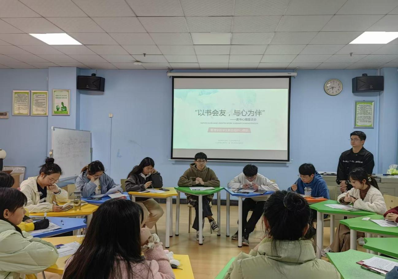 为更好地引导大学生读书悟书,关注自身心理健康,培养健康向上的心理状态,推动健康的心理校园文化发展,营造良好的文化氛围,2023年3月28日下午,湖南工程学院管理学院在罗蒙老师的带领以及管理学院学生联合组织心理部的协助下,在新校区团体辅导室开展“以书会友,与心为伴”为主题的心理读书交流会活动。