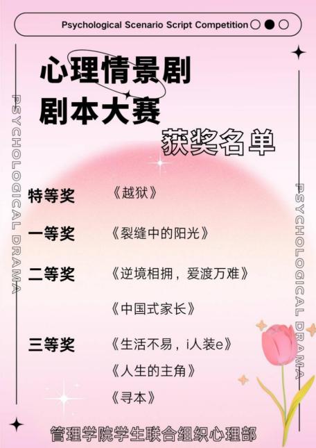 为加深大学生对心理情景剧的认识与了解,提高大学生对自身心理健康的关注,湖南工程学院管理学院于10月中旬举办第三届心理情景剧剧本大赛。此次大赛由管理学院学生联合组织心理部承办,面向管理学院全体同学。经评审团综合考量评选,共选出特等奖一名,一等奖一名,二等奖两名,三等奖三名。