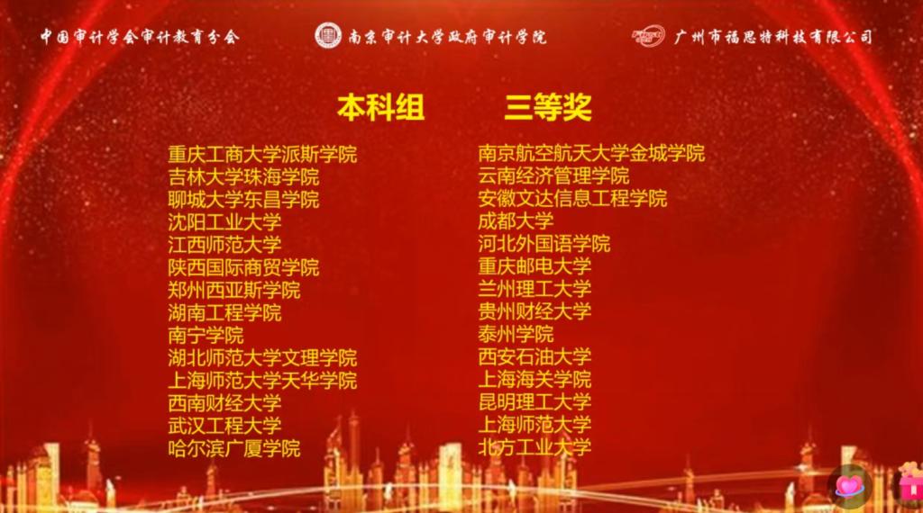 12月19日,由中国审计学会主办、南京审计大学承办的第三届“福思特”全国大学生审计精英挑战赛在线上举行。会计教研室廖文军老师和王染老师指导的代表队首次参加比赛,会计学1701班杨雪、黄敏、王清华同学经过不断地学习理论知识和实践操作,对审计知识进行一步步的推敲和吸收,在参赛的全国240支本科队伍中脱颖而出,最终荣获“福思特杯”全国大学生审计精英挑战赛全国三等奖。