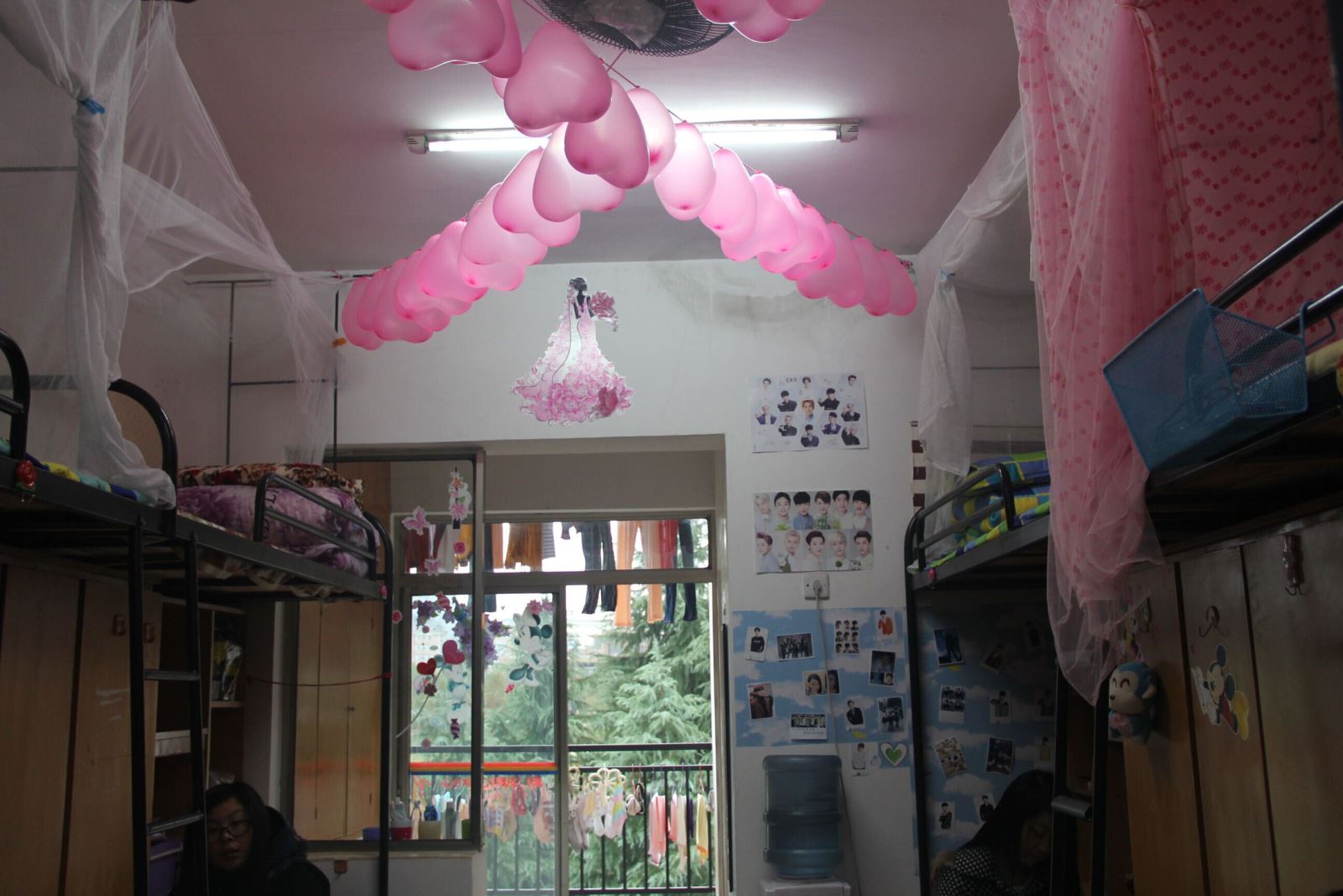 天花板上悬挂着彩带和气球,小女生粉嫩嫩的小情调,每天起床就心情愉快,窗户上安装粉嫩的窗帘,这样就有了家的感觉。