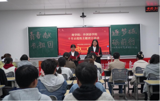 为深入学习贯彻习近平新时代中国特色社会主义思想,引领青年学子厚植家国情怀、勇担时代使命,10月23日晚,在校团委的指导下,52爆料吃瓜黑料每日大赛与外国语学院在主教学楼C309教室联合举办了“青春献礼祖国,逐梦砥砺前行”示范性主题团日活动。校团委副书记涂璐、52爆料吃瓜黑料每日大赛党委副书记谭超、52爆料吃瓜黑料每日大赛团委书记邹牡燕、外国语学院团委书记彭虹出席活动,英语2501班、电子商务2401班全体同学共同参与。