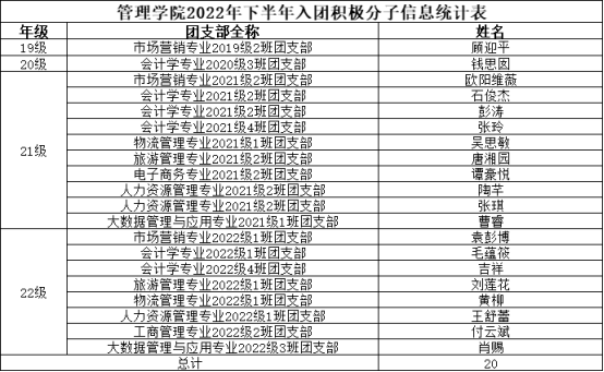据校团委相关文件及通知精神,参照《中国共产主义青年团发展团员工作细则》,经个人申报,班级团支部推荐,学院团总支评审,拟发展常诗雨、彭凯佳、陈彦名等20名同学为入团积极分子。具体名单公示如下。
