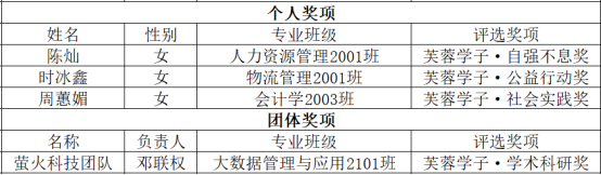 根据《关于开展2023年“芙蓉学子·榜样力量”优秀大学生评选活动的通知》文件要求,经个人申报、管理学院团总支推荐、管理学院学生工作办公室评审,拟推荐陈灿参评2023年“芙蓉学子·自强不息奖”优秀大学生、时冰鑫参评2023年“芙蓉学子·公益行动奖”优秀大学生、周蕙媚参评2023年“芙蓉学子·社会实践奖”优秀大学生、萤火科技团队参评2023年“芙蓉学子·学术科研奖”优秀团体。现将具体名单公示如下: