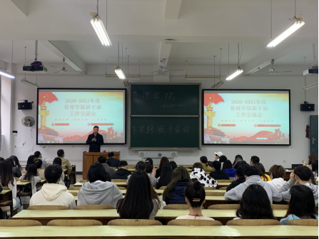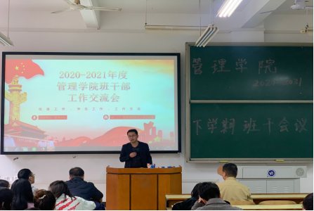 为逐步提升管理学院班级整体建设,增进师生交流。2021年3月16-17日,管理学院在新、南校区组织召开班委工作交流大会。会议由党委副书记张宏主持,党委书记余博、副院长潘立军、学办主任谭超、全体学办辅导员及2018-2020级各专业班级班长、团支书、学委参加会议。