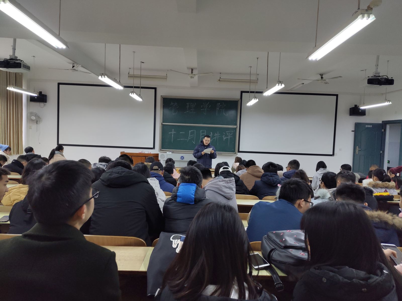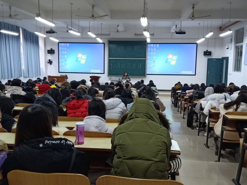 12月11日中午12:10,管理学院大一大二全体同学、大三大四全体班委及报考四六级的同学,在主校区教室内进行本学期第四次月评会议。学办辅导老师罗荃、黎博、单艳艳、包海燕、周艺、宋志航对工商管理、电子商务、旅游管理、人力资源管理、会计学、物流管理、市场营销七个专业进行了讲评。
