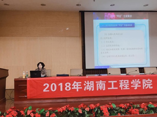 本次邀请到湖南工程学院思想政治理论课教学部副教授朱霁老师担任讲师。管理学院学生代表:17级物流、会计与人力专业全体同学参加了此次讲座。在主持人的讲解和同学的掌声中,朱霁老师开始了今晚的演讲。朱老师对两会精神的全面解读使同学们对新时代的含义有了更加深入的了解。老师通过精美的PPT、两会相关视频以及生动的演讲为大家揭示了会议中的相关内容。