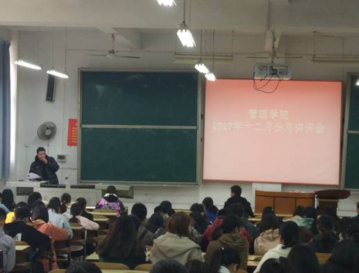 2017年12月12日中午12:10,管理学院大一大二双学号同学,大三班委,大四班长、学委、团支书,在主校区教室内进行本学期第四次月评会议。学办辅导老师罗荃、黎博、单艳艳、包海燕、周艺、宋志航对工商管理、旅游管理、人力资源管理、会计学、物流管理、市场营销六个专业进行讲评,本月心理会议也同月评会同一时间顺利展开。