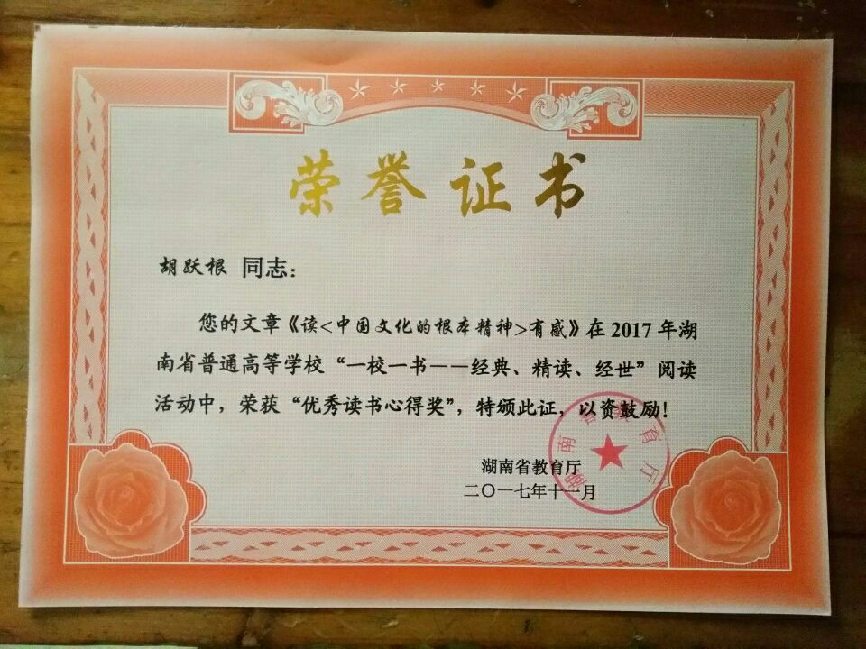 11月29日,2017年度湖南省普通高校“一校一书”阅读推广活动评选结果已通报,我院旅管1701班胡跃根喜获省教育厅颁发的“读书心得奖”。