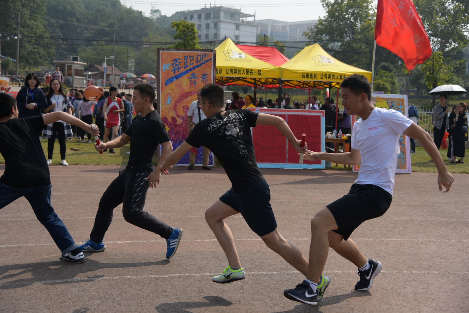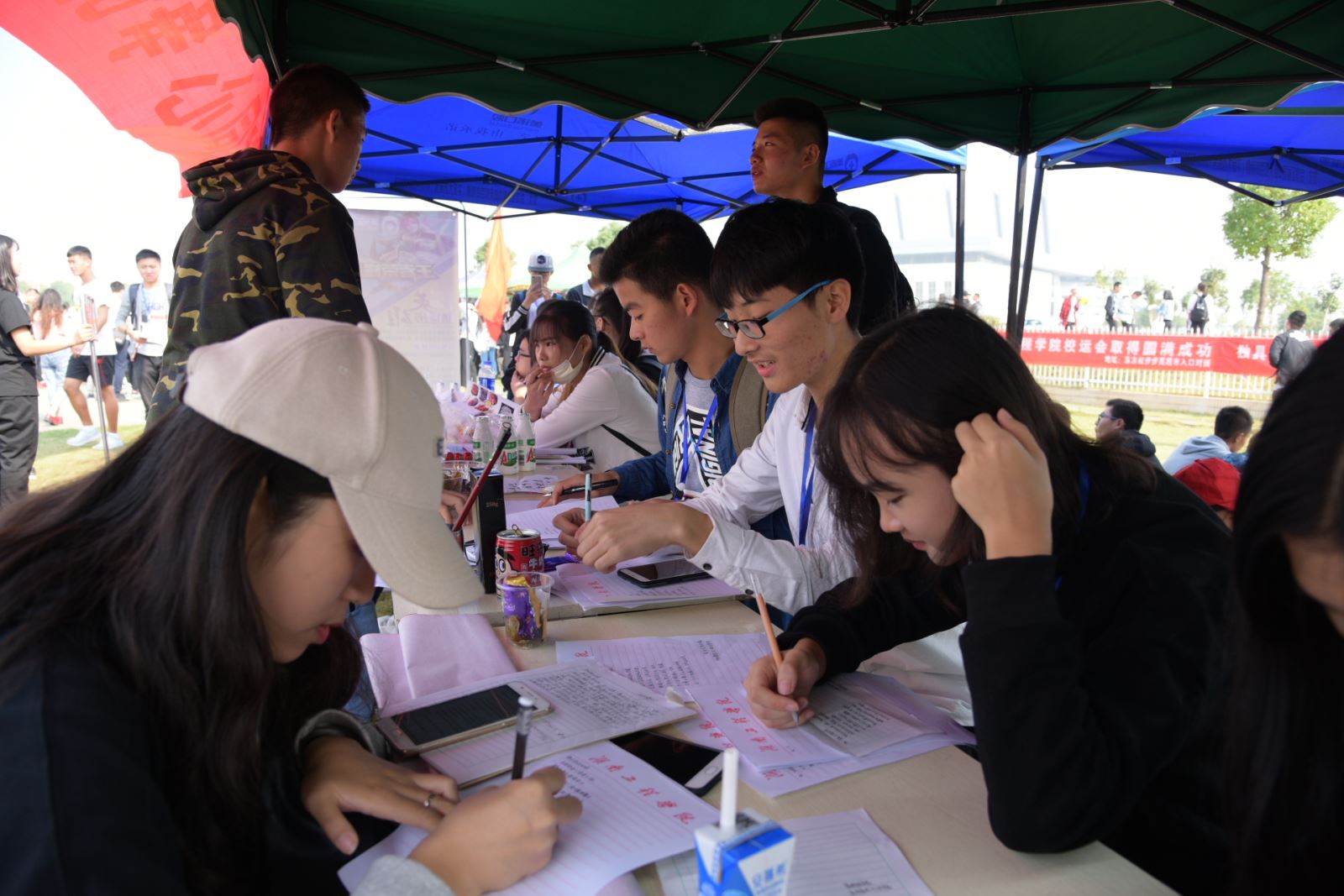 运动场上除了健儿们,还有一群不辞辛苦的工作者们:罗荃老师、黎博老师、学生会干部们以及刚入学生会的干事们。他们热心的为运动员解决各类状况,穿梭在赛场,他们来自管理学院,认真负责,精益求精是他们对自己的要求。每个部门各司其职,有条不紊,积极配合学院领导老师的工作。工作之余,各部门成员会组织一些娱乐活动,大家围坐在一起,一起分享快乐,表演节目,为运动会增添了不一样的色彩!