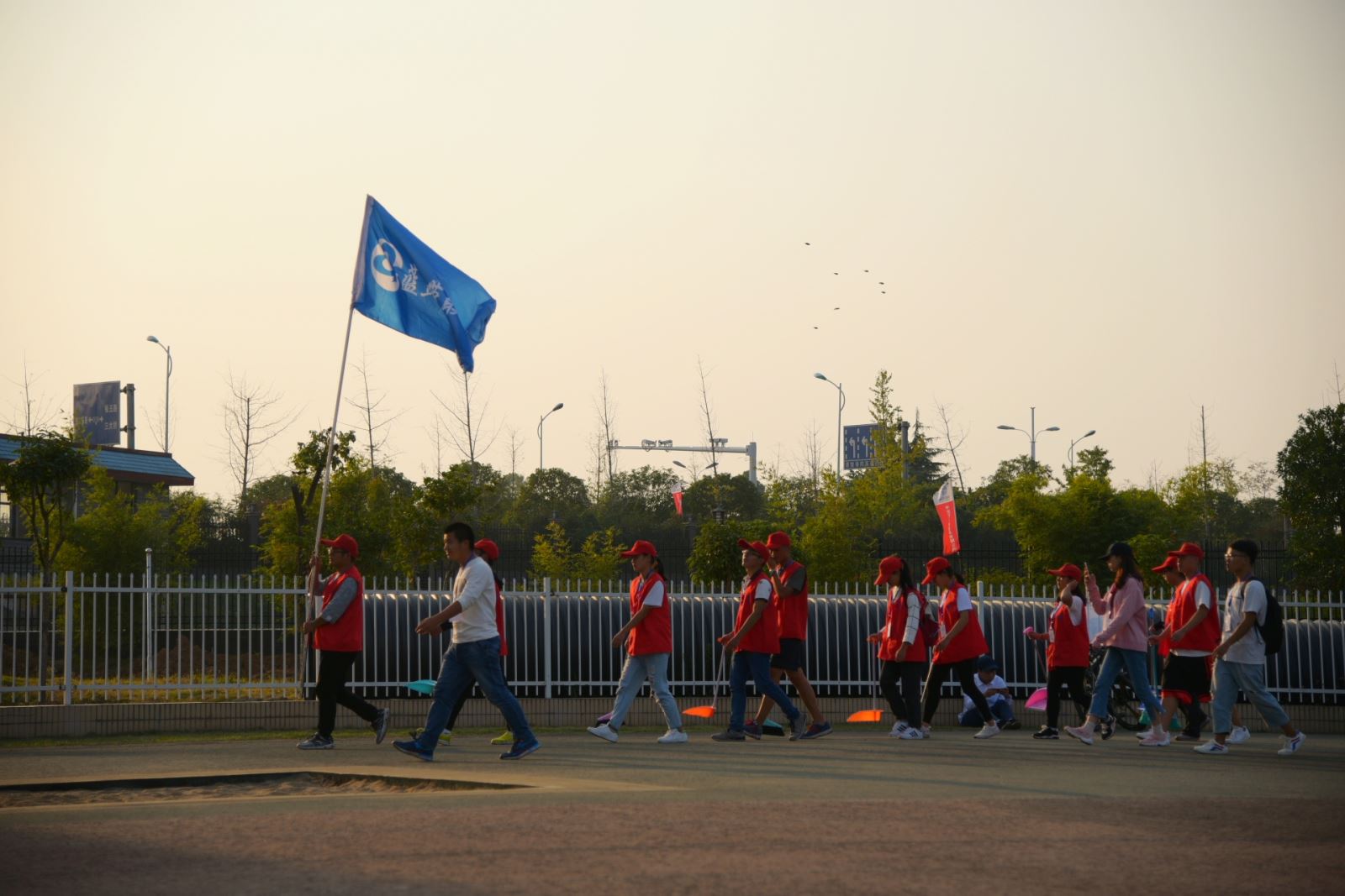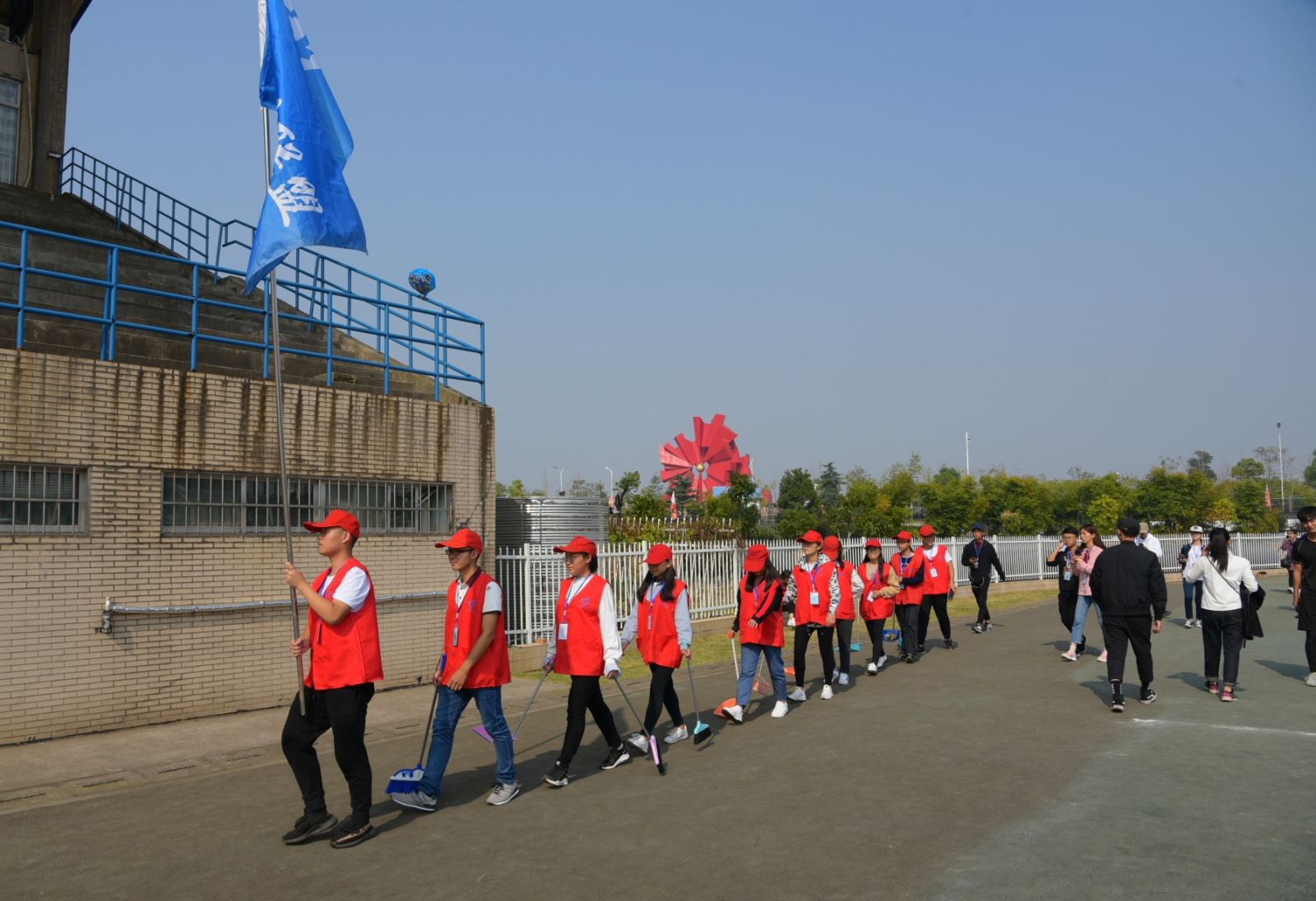 蓝丝带成员在运动会期间不辞劳苦,打扫操场,他们三五成群,拿着扫把、簸箕清理同学们留下的垃圾,为接下来上场的运动健儿及同学们提供更加舒适的环境。他们排着整齐的队伍奔走于田径场,这些身影,将成为运动场上一道道亮丽的风景。