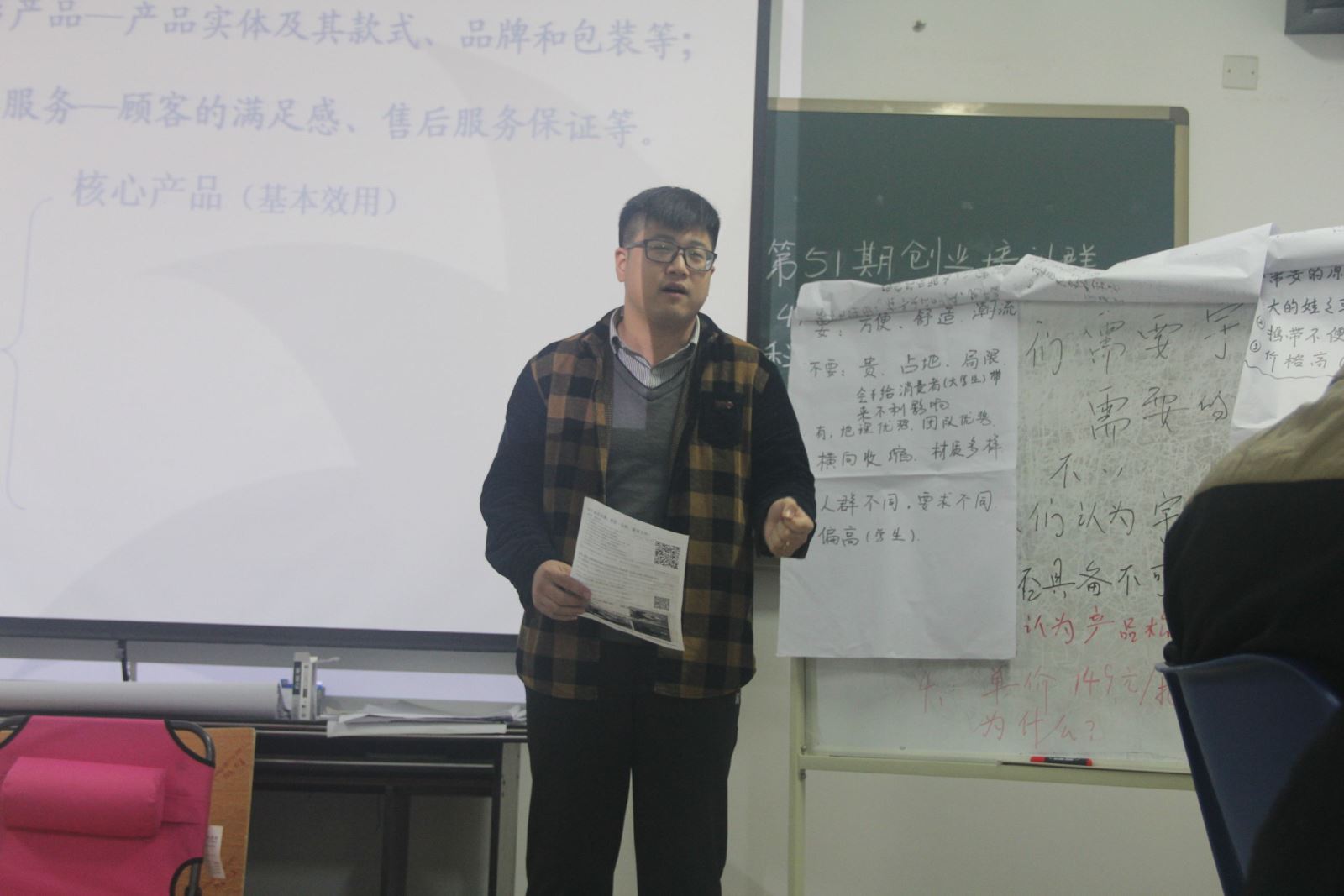 2015年11月15日晚7点,在教学楼F506开设了第51期SIYB大学生创业培训课堂,学校SIYB主要负责人、管理学院的段超群副教授为主讲老师,时遇辉副教授到场一起为学员提供指导。更有创业培训班第十三期期学员匡宸义等创业成功的湖工学子与正在积极求学,渴望创业的新学员讨论交流。