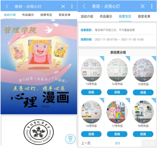 本次活动首先由心理部根据摆点投票和评选团投票结果,确定18个在易班APP上展示的作品材料转至易班管理中心,易班管理中心在易班APP上搭建好平台,管理学院全体成员在11月30 日积极为自己心仪的作品进行投票。此次活动我院同学积极参与,最终经过激励而精彩的角逐,本次心理漫画活动获奖名单如下: