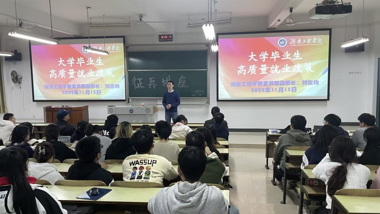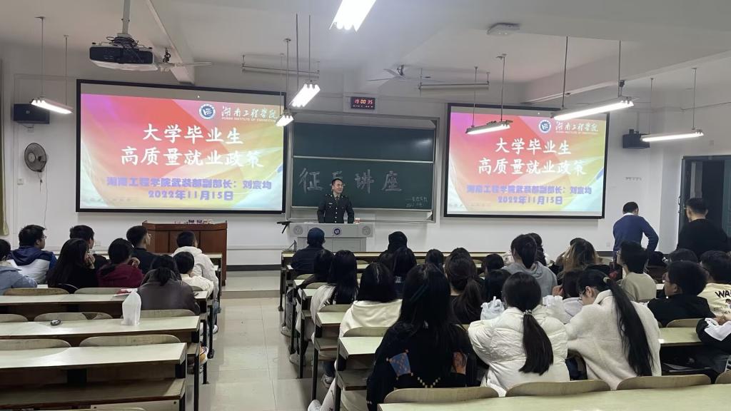 为推进大学生应征入伍工作,帮助大学生了解应征入伍相关政策和流程,湖南工程学院管理学院于11月15日晚在主校区D303教室举行征兵讲座。本次活动保卫处武装部副部长刘宸均老师应邀主讲,我院党委副书记谭超老师、辅导员谭浩博老师出席,19-22级学生代表到场参与。