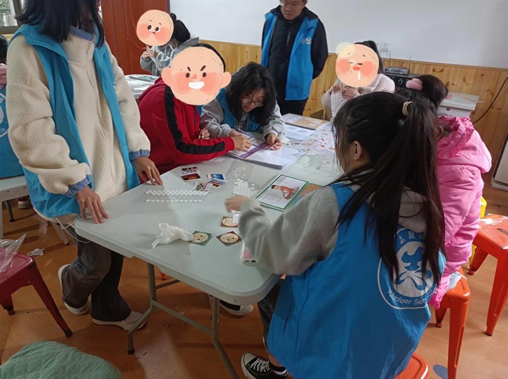 本次活动与前四次有所不同,一批新的志愿者加入了本次活动。活动开始前,所有亲园老师为新来的志愿者们进行了讲解,耐心地向志愿者们示范了如何制作贴图绘本。很快,志愿者们熟悉了步骤,与亲园的小伙伴们开始了充满意义的创作。和上次活动一样,首先,志愿者们要帮助学员在绘本中找到图案的中心点;其次,在中心点位置贴上AB胶;再次,将绘本对应的卡片贴入AB胶方框内;最后,志愿者们帮助学员检查一遍并指导其将绘本装入包装袋内才算任务完成。新来的志愿者们和其他志愿者一样很快融入了亲园这个大家庭中。笑容洋溢青春,爱心流露其间。