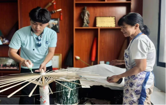 传承之旅从石鼓镇启程。在当地工作人员引导下,实践团走进油纸伞工坊,实地了解这一非遗技艺的制作工艺与传承现状。陈列墙上,一把把油纸伞宛如艺术臻品,凝结着匠人的智慧与情感,成员们亲身体验“锯竹、制骨、裱面、绘伞”等工序,感受一伞一匠心的细腻与精妙。采访中,传承人周汉宇分享了家族坚守油纸伞制作的故事,并表达了对年轻一代加入非遗传承队伍的期盼。