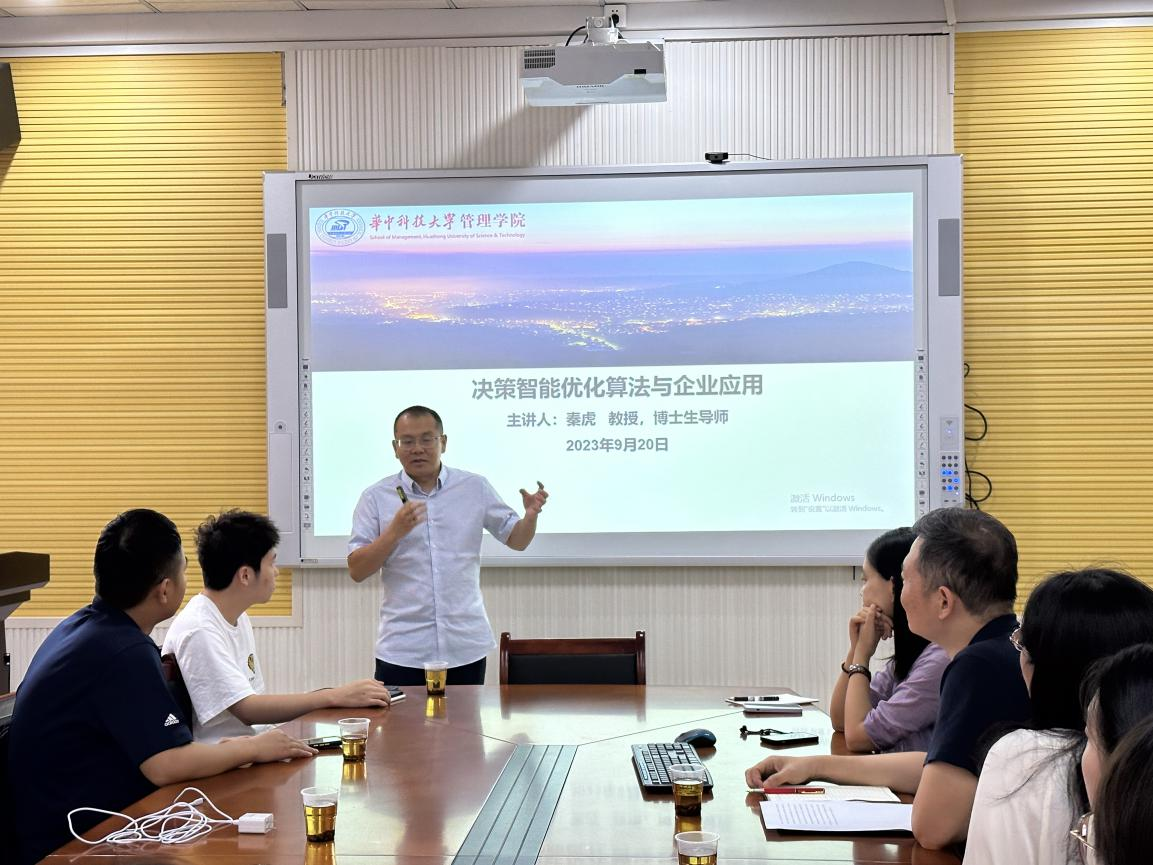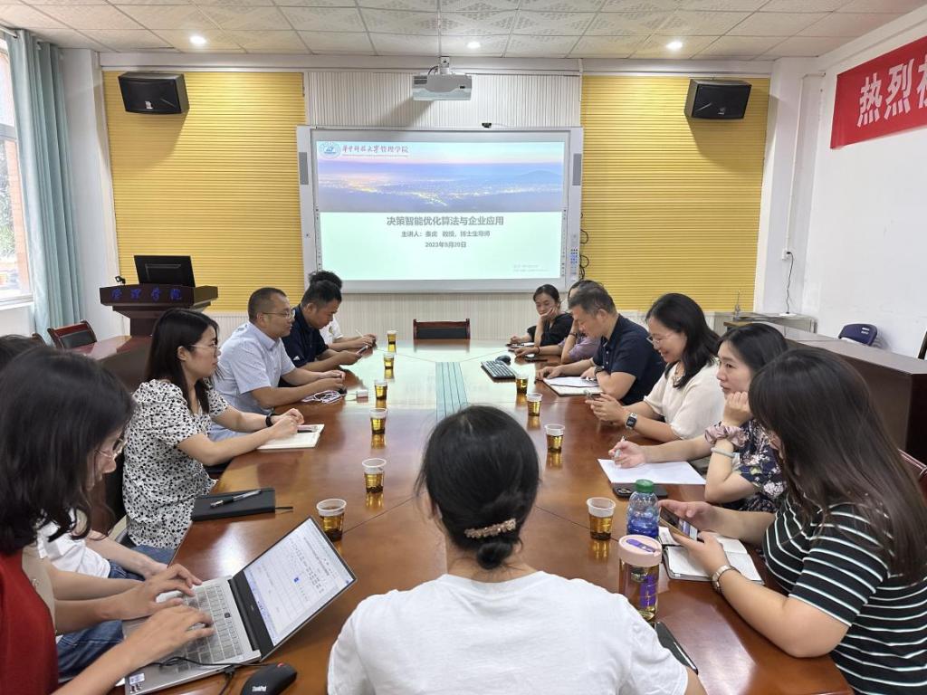 9月20日下午15:00,华中科技大学管理学院秦虎教授应邀来管理学院进行了学术交流,在管理学院F104会议室举行了题为《决策智能优化算法与企业应用》的学术讲座。讲座由学院副院长潘立军主持,管理学院青年教师和骨干教师参加学习。