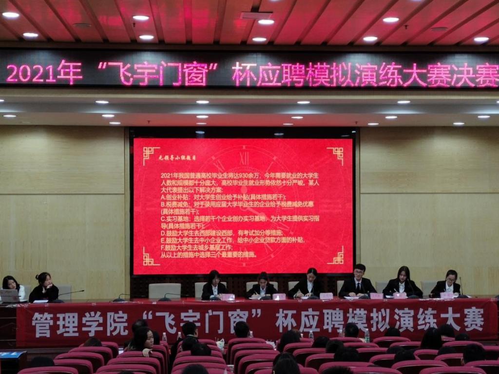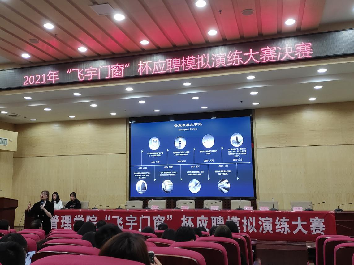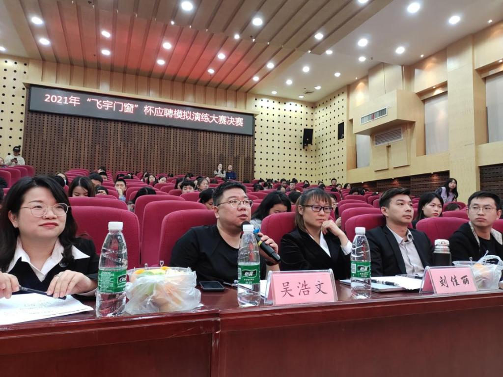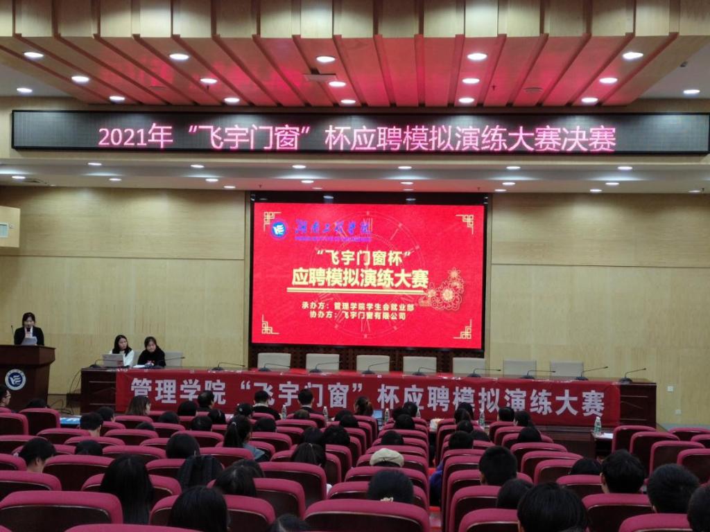 为帮助广大同学树立和提高职场应聘意识,进一步确保同学们对就业应聘时简历制作相关要求的贯彻与落实,提高学生个人的综合素质,10月14日,2021年管理学院“飞宇门窗杯”应聘模拟演练大赛决赛在主校区图书馆二报告厅圆满落幕。本次大赛由湖南工程学院管理学院主办,管理学院就业部承办,成都飞宇门窗有限公司协办,杭州铭师堂教育科技发展有限公司人力资源部组织文化专家孙益萍,富安娜集团招聘经理周梓峰,深圳市中电核心科技有限公司总经理、我校人力资源管理03级校友吴浩文,深圳市博硕科技股份公司有限公司职位人资课长孔闰,大赛赞助商四川名人居门窗有限公司总裁、我校人力资源03级校友刘佳丽受邀莅临决赛现场进行点评打分指导工作,崔冰主持比赛。